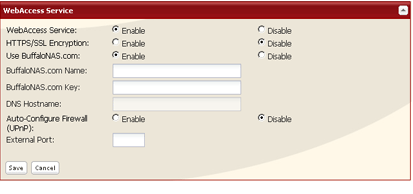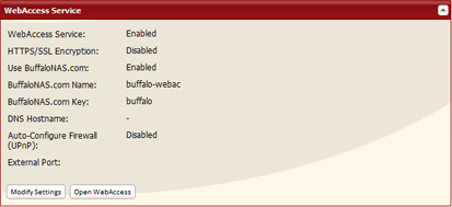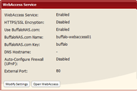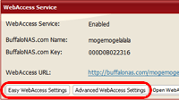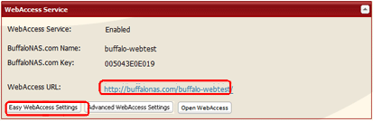 Haga clic en Easy WebAccess Settings (Configuración sencilla de WebAccess). Nota: Se muestra la URL utilizada para acceder a BuffaloNAS como [WebAccess URL (URL de WebAccess)]. |