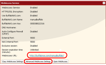 Haga clic en [Advanced WebAccess Settings (Configuración avanzada de WebAccess)]. Nota: Se muestra la URL utilizada para acceder a BuffaloNAS como [WebAccess URL (URL de WebAccess)]. |