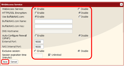 (1) Habilite [WebAccess Service (Servicios WebAccess)]. (2) Habilite [Use BuffaloNAS.com (Utilice BuffaloNAS.com)]. (3) Introduzca [BuffaloNAS.com Name (Nombre de BuffaloNAS.com)] (un nombre para la cuenta de WebAccess). Anote este nombre en un lugar seguro. Lo necesitará para utilizar WebAccess. (4) Elija una contraseña para [BuffaloNAS.com Key (Clave de BuffaloNAS.com)]. (5)Se recomienda el uso de BuffaloNAS.com para la mayor parte de los usuarios, pero se puede especificar un servicio DNS diferente si se introduce el nombre de host en el campo [DNS Hostname (Nombre de host de DNS)]. (6) Si el rúter admite UPnP, se recomienda seleccionar [Enable (Habilitar)] para [Auto-configure Firewall (UPnP) (Autoconfigurar cortafuegos [UPnP])]. UPnP debe habilitarse en el rúter para que funcione. (7) Para configurar el cortafuegos de forma manual sin utilizar UPnP, introduzca un número de puerto en el campo [External Port (Puerto externo)]. En la configuración del rúter, envíe este número de puerto externo a un puerto interno de la TeraStation o la LinkStation de su red local. Si no está utilizando UPnP, configure la conversión de direcciones del rúter de forma manual. (8) Introduzca [NAS Internal Port (Número de puerto interno NAS)] (opcional) para la TeraStation o la LinkStation de la red. Se recomienda el número de puerto predeterminado (9000). (9) Si está habilitada la opción [Exclusive session (Sesión exclusiva)], no se podrá utilizar una cuenta de usuario para iniciar sesión simultáneamente en varios equipos en WebAccess. Sólo estará activo el último inicio de sesión. (10) Introduzca una hora en minutos (1 - 120) antes de que los usuarios inactivos cierren sesión en WebAccess, o seleccione [Unlimited (Ilimitado)]. Nota: Si está habilitada la opción [Exclusive session (Sesión exclusiva)], no se puede seleccionar la opción [Unlimited (Ilimitada)] para [Session expiration time (minute) (Hora de vencimiento de la sesión [minuto])]. (11) Haga clic en [Save (Guardar)].