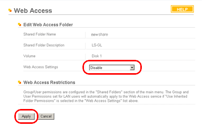 (1) Elija uno de los siguientes niveles de seguridad en [Web Access Settings (Configuración de Web Access)]: [Disable (Deshabilitar)]: no se permite el acceso a WebAccess. [Allow Anonymous (Permitir anónimo)]: Cualquier persona puede acceder (ver) a las carpetas compartidas. [Allow All Groups / Users (Permitir todos los grupos/usuarios)]: Todos los grupos y usuarios que estén registrados en la LinkStation o la TeraStation pueden utilizar WebAccess. [Use Inherited Folder Permissions (Utilizar permisos heredados de carpeta)]: Los usuarios y los grupos tienen los mismos permisos de acceso en WebAccess que los que tienen de forma local. Si no se establecen restricciones para la carpeta compartida, no se mostrará esta opción. (2) Haga clic en [Apply (Aplicar)]. |