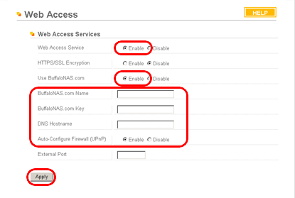 (1) Habilite [Web Access Service (Servicios Web Access)]. (2) Habilite [Use BuffaloNAS.com (Utilice BuffaloNAS.com)]. (3) Introduzca [BuffaloNAS.com Name (Nombre de BuffaloNAS.com)] (un nombre para la cuenta de WebAccess). Anote este nombre en un lugar seguro. Lo necesitará para utilizar WebAccess. (4) Elija una contraseña para [BuffaloNAS.com Key (Clave de BuffaloNAS.com)]. (5) Si el rúter admite UPnP, se recomienda seleccionar [Enable (Habilitar)] para [Auto-configure Firewall (UPnP) (Autoconfigurar cortafuegos [UPnP])]. UPnP debe habilitarse en el rúter para que funcione. (6) Haga clic en [Apply (Aplicar)].